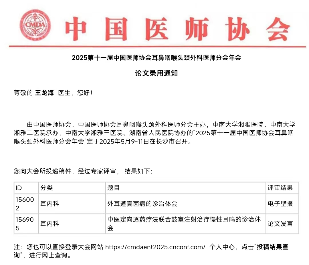 郑州民生耳鼻喉医院专家积极投稿,三篇论文成功被大会收录,充分展示了我院在耳鼻喉疾病临床诊疗和中西医结合治疗领域的科研实力与创新成果。