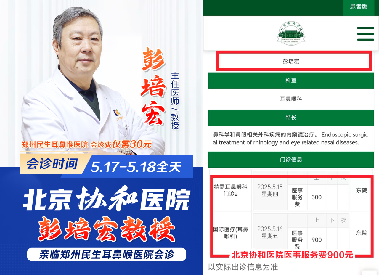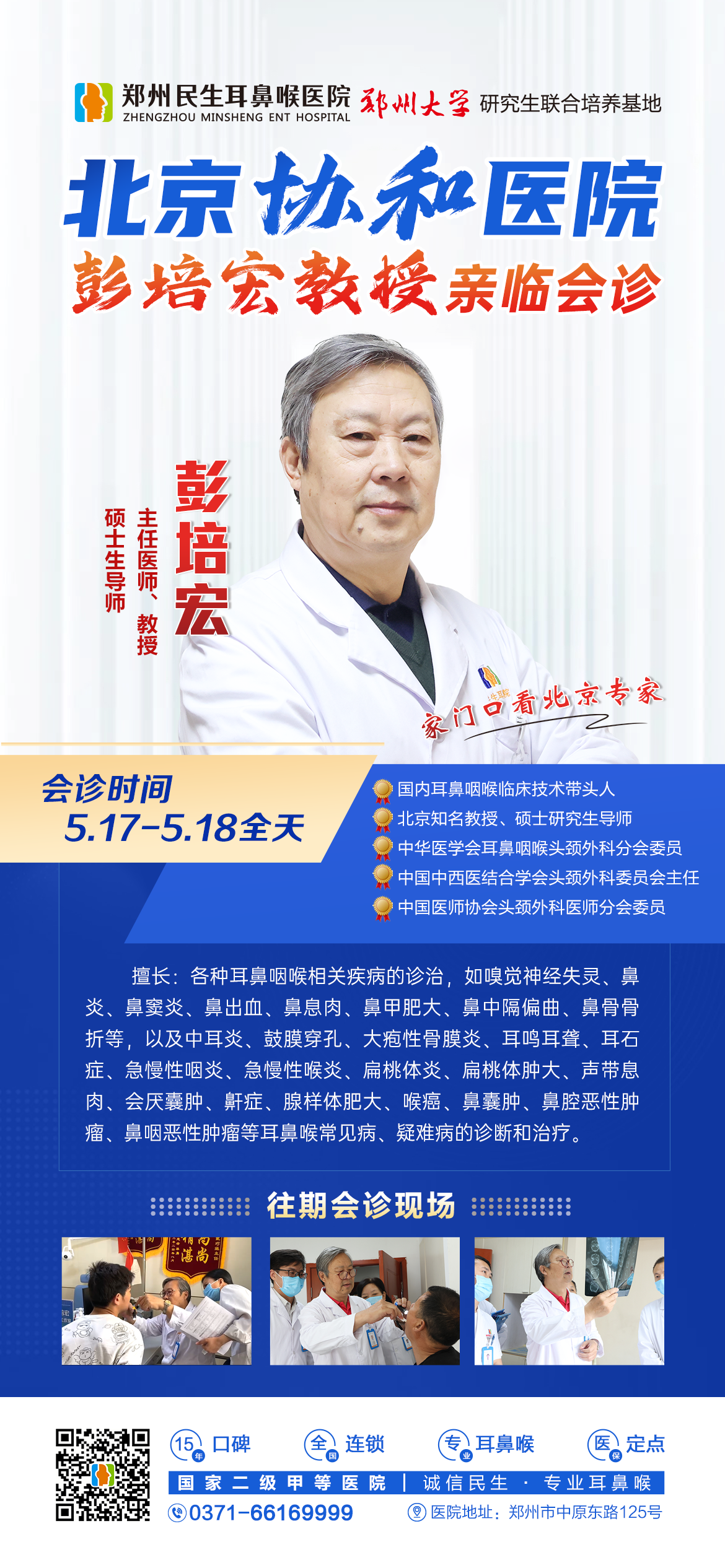 5月17—18日,北京协和医院耳鼻喉专家彭培宏教授将亲临郑州民生耳鼻喉医院,为郑州及周边患者提供专业、高效的诊疗服务!