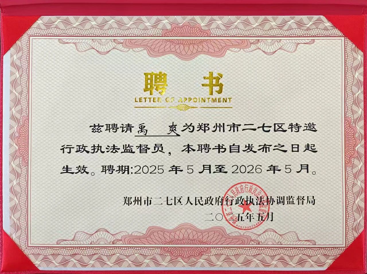 “郑州市二七区特邀行政执法监督员”,并被任命为