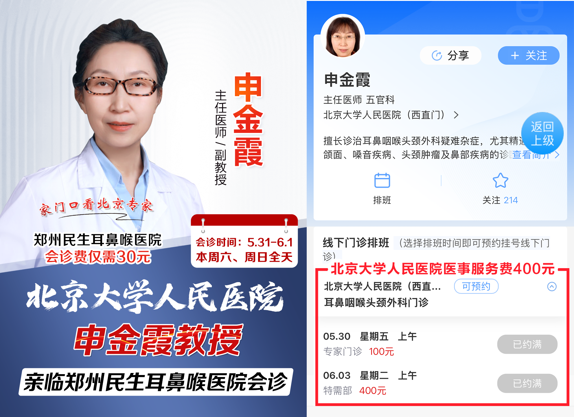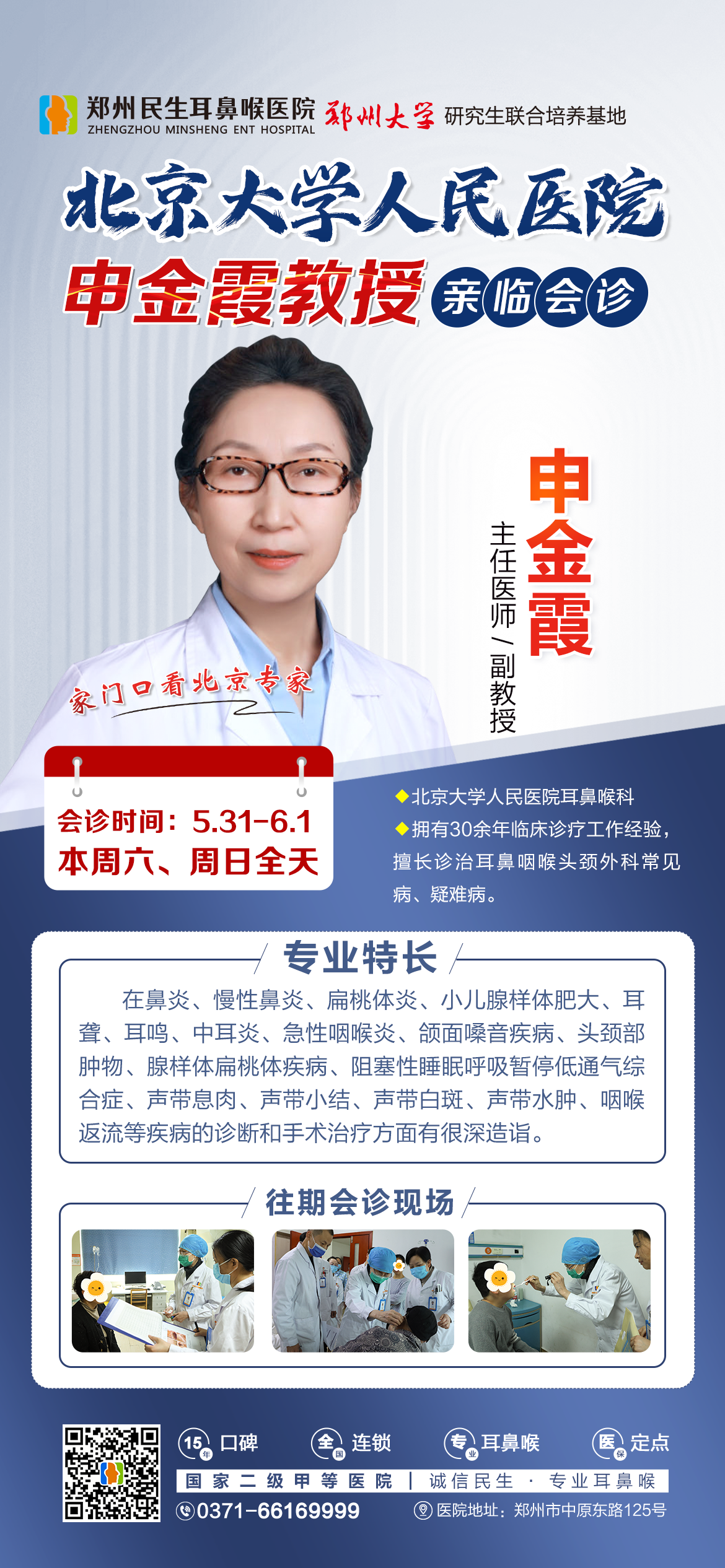 5月31-6月1日,北京大学人民医院耳鼻喉专家申金霞教授亲临郑州民生耳鼻喉医院,为郑州及周边患者提供专业、高效、精准的诊疗服务!