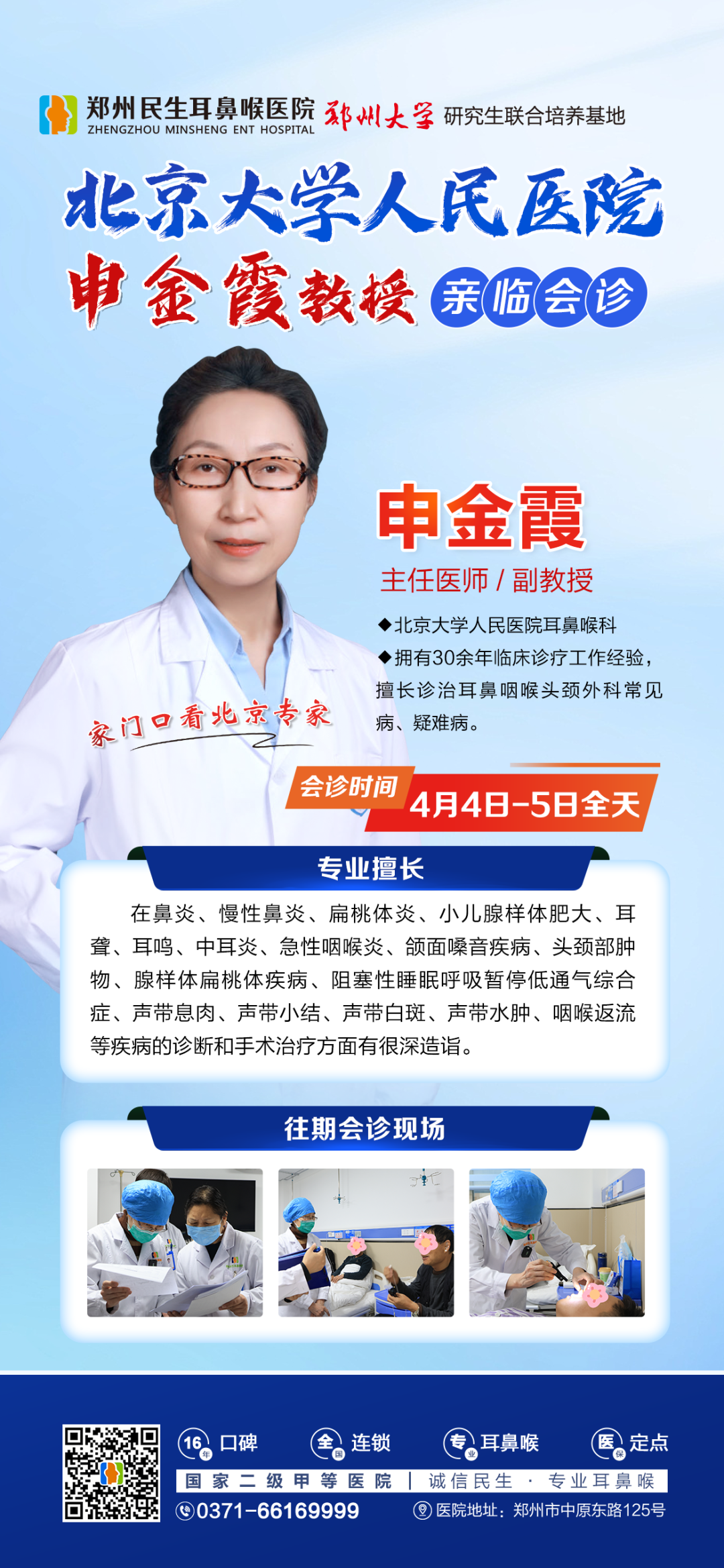 4月4日-5日(周六、周日),北京大学人民医院耳鼻喉专家申金霞教授亲临郑州民生耳鼻喉医院限号会诊。成人、儿童耳鼻喉问题一站式解决,让您在假期里也能享受到北京三甲专家的优质诊疗服务。